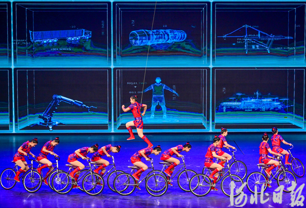9月28日,河北省杂技团演员正在吴桥江湖大剧院表演《雏凤凌空—— 女子集体车技》。 河北日报记者 李东宇摄