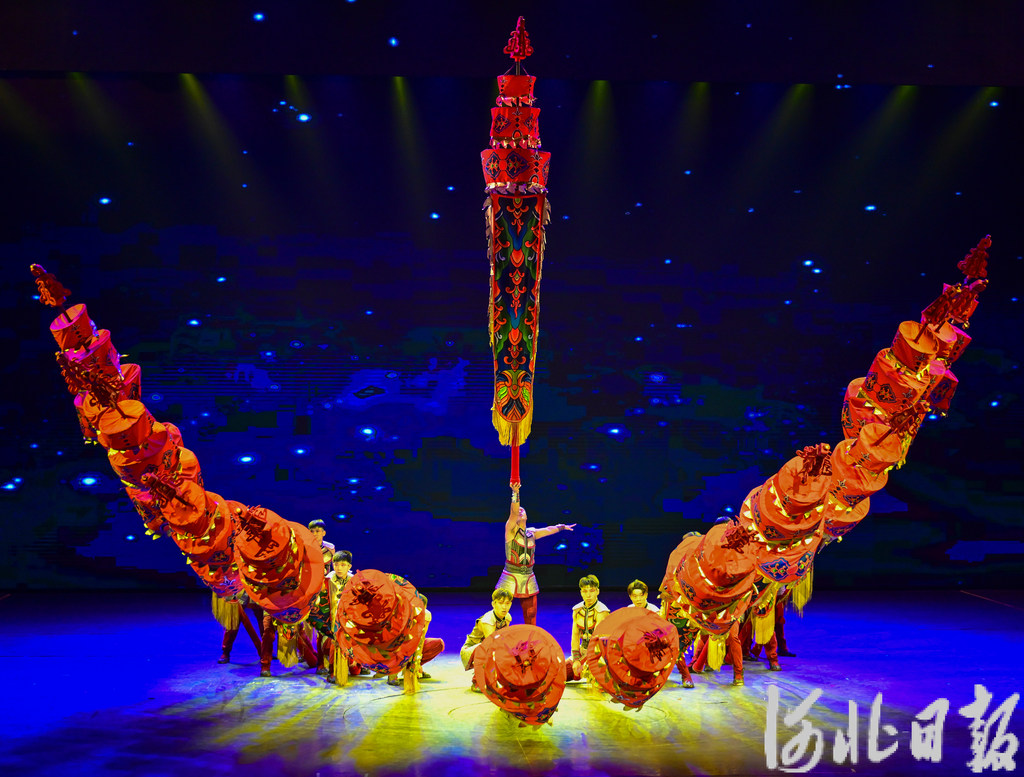 9月28日 ,“为人民绽放——国家艺术基金优秀杂技节目展演”在吴桥江湖大剧院举办,沧州杂技团演员正在表演《龙跃神州——中幡》。河北日报记者 李东宇摄