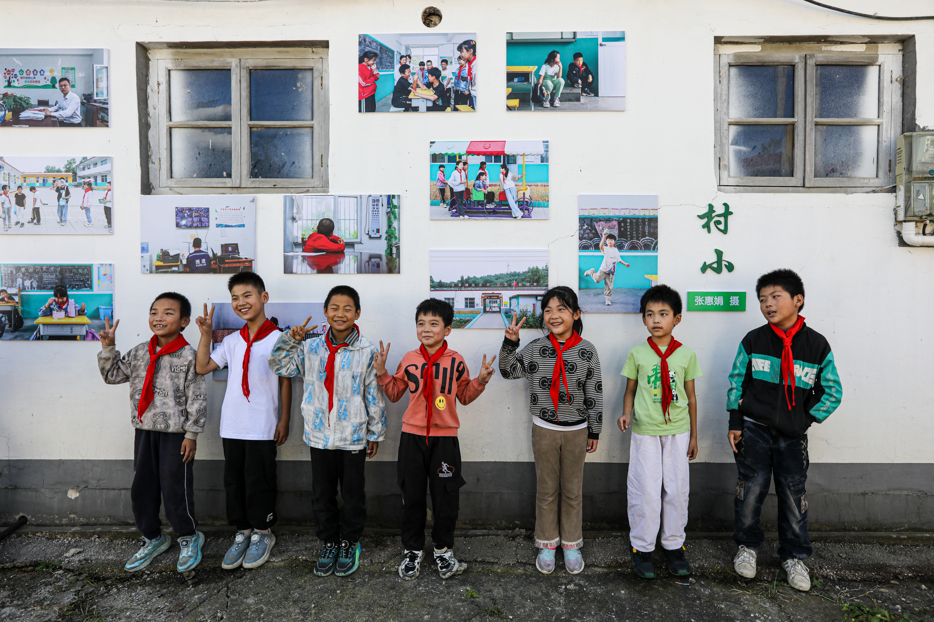 在阜平县易家庄村现场,秋日暖阳洒在村内主干道易兴路上,百余幅装裱精美的摄影作品张贴在村民房前屋后,形成一条雅致的艺术长廊。摄影作品《婚礼》《一户一景》《易家庄秧歌队》《春节》《备年货》《村边的小河》等拍摄题材都来自于易家庄村。万宝庄小学老师焦鑫带领二、三年级学生前来参观。墙上张贴的摄影系列作品《村小》拍摄地点就是万宝庄小学,作品展现了校园环境、学生课堂、课间活动等这所村庄小学日常。三年级男生于清晨指着一张课间同学围在一起的照片给记者介绍:“这里有我,我和同学们正在玩卡片。”革命摄影家刘峰作品《中国土地法大纲》张贴在当年拍摄原址,与今日摄影家用镜头记录的田园生活《易家庄种红薯》相呼应。晋察冀边区革命纪念馆副馆长王芳说,易家庄有深厚的红色历史,土地就像老百姓的生命一样重要。如今红薯是村里的种植特色,镜头里的老百姓喜笑颜开,感觉到生活幸福,这两组照片张贴在一起,用艺术形式使红色摄影得到延续和传承。