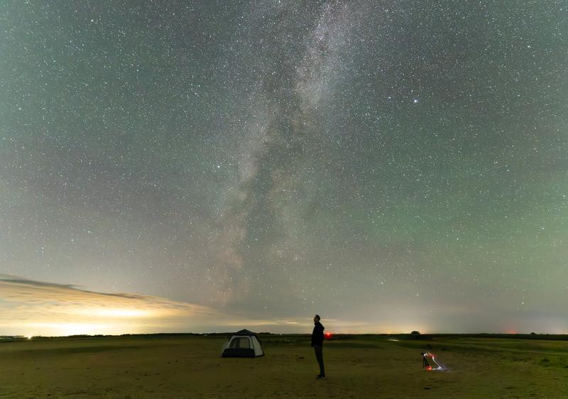 2025年8月21日,在黑龙江省佳木斯市桦川县,星空摄影爱好者在观赏银河和两侧的牛郎星、织女星。新华社发(陈志国摄)