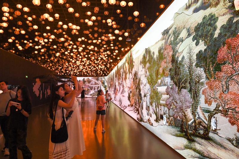 2025年8月20日,游客在江苏省南京市新街口一家商场内观赏拍摄“金陵图数字艺术展”。新华社发(杨素平 摄)