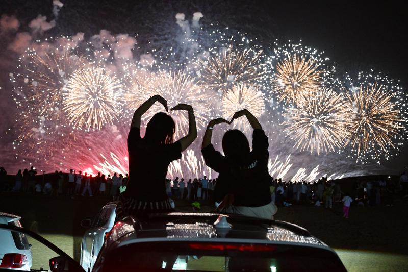 2025年8月10日,游客在宁夏中卫市沙坡头区观看烟花表演。新华社发(袁宏彦摄)