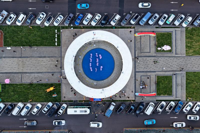 2025年7月11日,在新疆昭苏县天马旅游街区,当地文艺工作者为游客表演歌舞节目(无人机照片)。新华社发(杨天民摄)