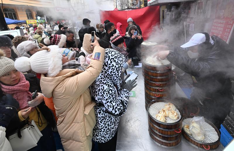 2025年1月28日,在哈尔滨市红专街早市,游客排队买包子。新华社发(刘洋 摄)