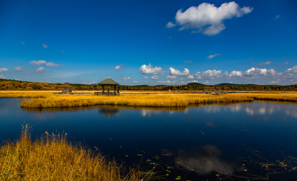 湛蓝的天空、洁白的云朵、深邃的湖水
