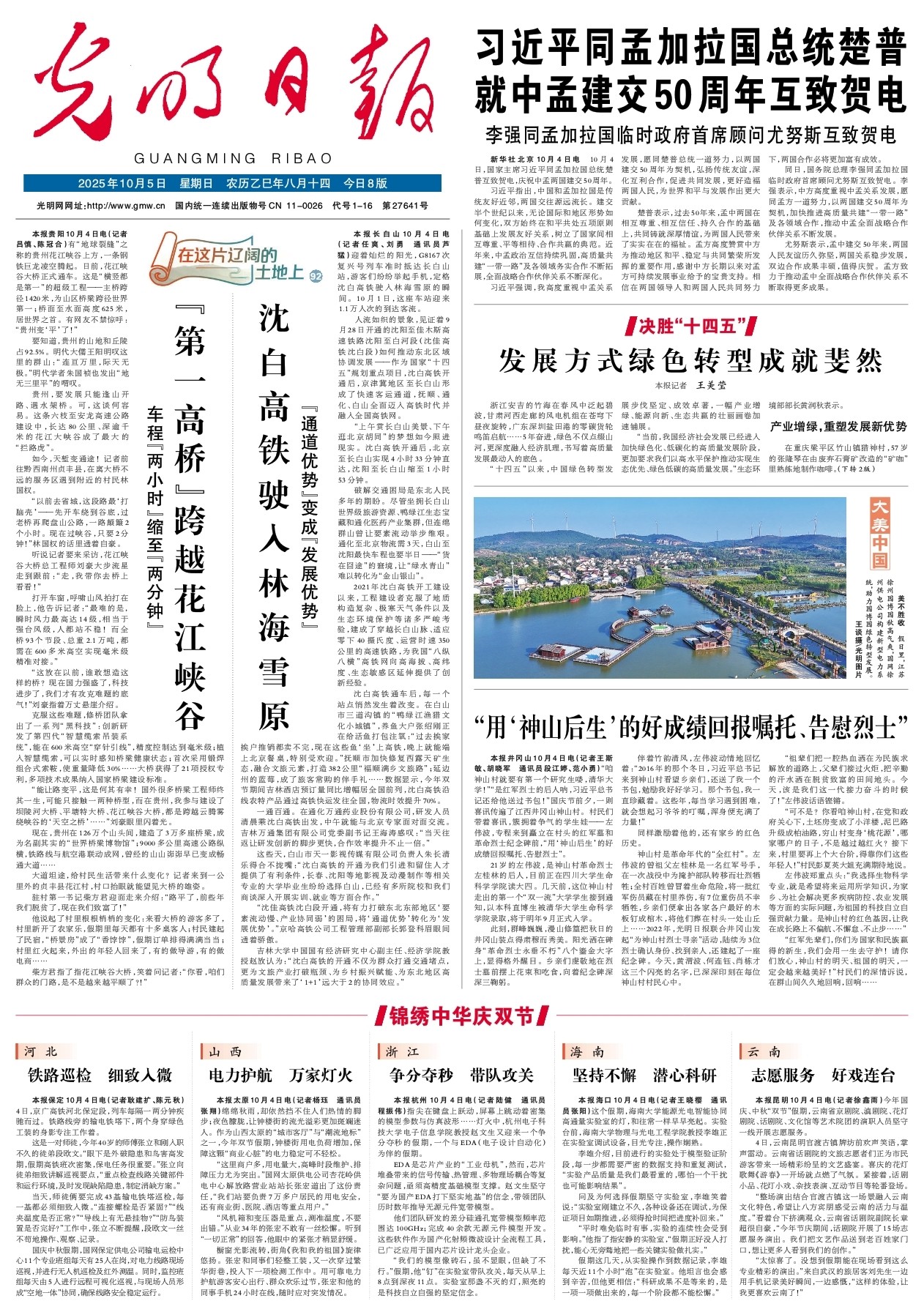 本报保定10月4日电(记者耿建扩、陈元秋)4日,京广高铁河北保定段,列车每隔一两分钟疾驰而过。铁路线旁的输电铁塔下,两个身穿绿色工装的身影专注工作着。