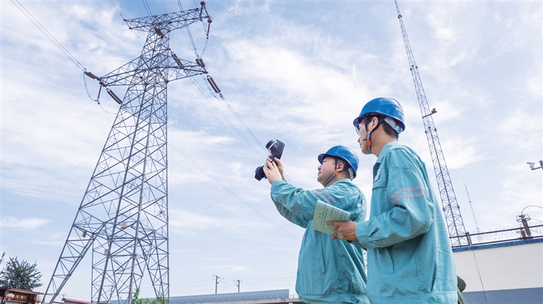 10月4日,京广高铁保定段,列车每隔一两分钟疾驰而过。紧邻铁路线的输电铁塔下,两个身穿绿色工装的身影专注地操作着无人机遥控器和红外测温仪,阳光照在他们胸前,党徽闪闪发光。