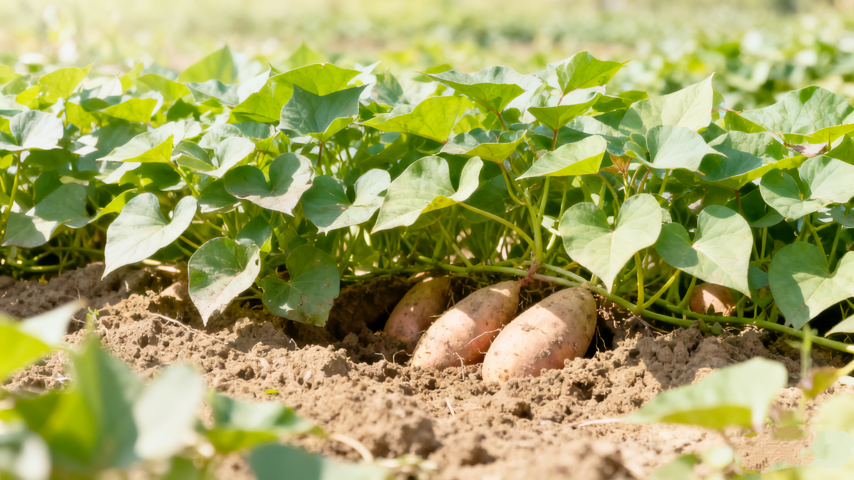 蹲在田埂上,我怎么也想不到这些柔弱的秧苗埋到土垵里,啜饮露水,沐浴阳光,浑身充盈着一股说不清道不明的精气神,竟能把大片黄土地铺染成一张张浓密的绿地毯。除非亲眼所见,否则难以领略什么叫壮阔如海。绿如翡翠的叶子下,藤蔓像长蛇一样四处蔓延,又宛若一条条血管,把叶片光合作用生成的养分源源不断地输向地下的根茎。在大片绿的遮掩下,好像变戏法一样,红薯根部的地皮拱开一道道缝隙,犹如解开了生命密码。