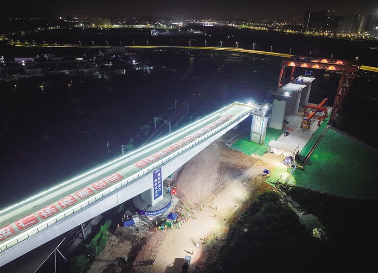 10月10日凌晨,由中铁二十五局承建的深江铁路广中江特大桥跨广珠货运铁路转体桥成功转体,该转体桥重达11216吨、跨度160米,位于深江铁路关键控制性工程广中江特大桥跨虎跳门桥段。深江铁路是我国“八纵八横”高铁网沿海通道的重要组成部分,线路起自深圳西丽站,正线全长116公里,跨越珠江口,串联深圳、东莞、广州、中山和江门等5座城市。该工程建成后,深圳与江门可实现1小时内通达。 新华社记者 刘大伟 摄