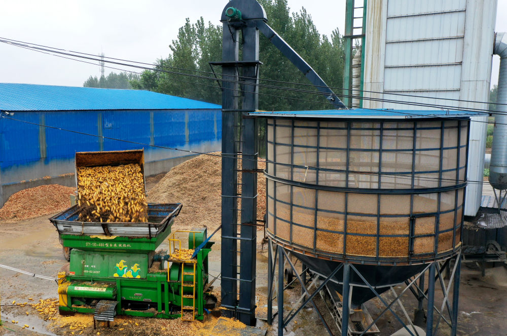 在衡水市阜城县,新收获的玉米被源源不断地送入烘干仓。新华社记者王昆 摄