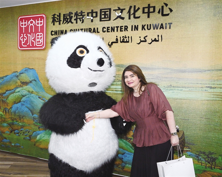 10月12日,在科威特哈瓦利省,一名女子在科威特中国文化中心与熊猫人偶互动合影。科威特中国文化中心12日晚在科威特哈瓦利省举行揭牌仪式,开始正式运营。中国驻科威特大使馆临时代办刘翔、科威特国家文化、艺术与文学委员会助理秘书长阿努德公主、科威特重要社团组织代表、多国驻科使节及各界对华友好人士等百余人出席仪式。 新华社发(阿萨德 摄)