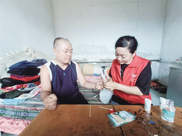 蠡县“村嫂”为北高晃村村民楚杏乐测量血糖。