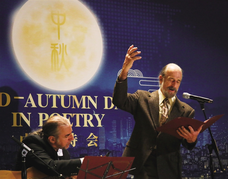 10月13日,在位于纽约的联合国总部,纽约诗人柯克·拉森在2025“天涯共此时——中秋诗会”上朗诵他专门为中秋创作的英文现代诗《又到丰收佳节》。2025“天涯共此时——中秋诗会”13日在联合国总部举行。活动以诗为媒,以月为桥,旨在传递中秋佳节所蕴含的“团圆、和谐、丰收”之意,促进东西方文明交流互鉴。 新华社记者 张凤国 摄