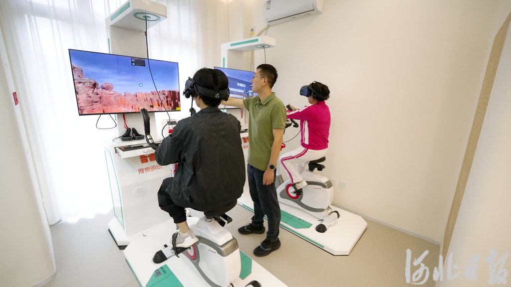 10月9日,在雄安新区容东片区龚庄社区党群服务中心“幸福空间”的VR单车运动空间,社区居民正戴着VR眼镜“骑行”。河北日报见习记者郝金钰摄