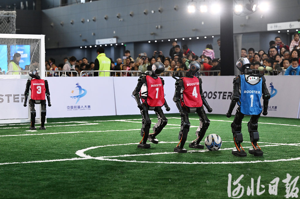 10月18日,3V3足球赛场上,人形机器人“球员”正在比赛。河北日报记者史晟全摄
