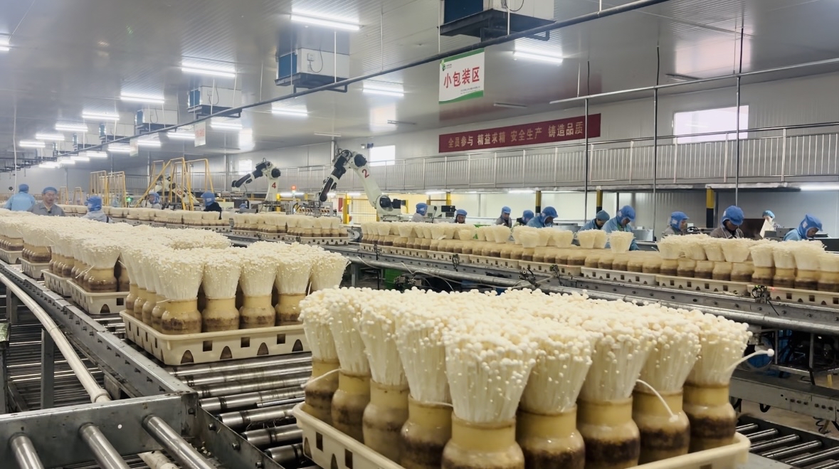 金针菇达到采收标准后,通过自动化流水线进入包装车间,由工人与智能机器人协同完成采收、分拣、包装,再通过冷链物流发往京津冀、东三省、内蒙古、山西等地,走上千家万户的餐桌。