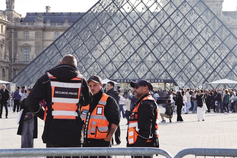 10月22日,安保人员在法国巴黎卢浮宫博物馆外巡逻。在法国卢浮宫抢劫案事发3天后,这座博物馆22日恢复开放。 新华社记者 张百慧 摄