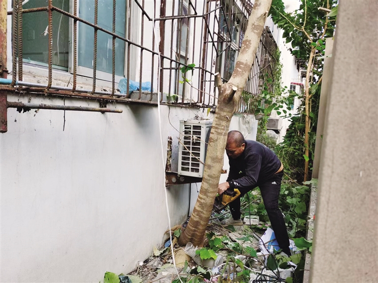 据了解,这棵构树胸径约15厘米,不断生长的树干和枝叶对4号楼楼体构成威胁,存在外墙开裂、渗水的风险。此外,繁茂的树冠也为蚊虫滋生提供了条件,影响低层住户居住环境。