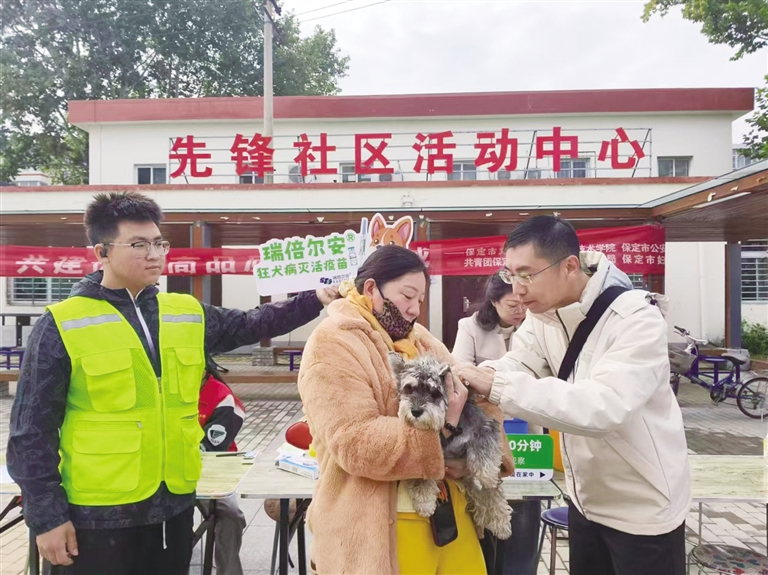 除了环境美化升级,现场的专业服务更让养宠居民倍感贴心。保定职业技术学院畜牧兽医系师生专门设置服务台,为20余只宠物猫狗规范接种狂犬病疫苗并向宠物主人讲解日常养宠小技巧。同时,河北农大大学生和环保志愿者分组向居民发放文明养宠宣传单,解答居民关于宠物饲养的各类疑问。
