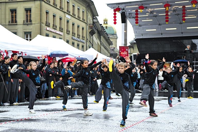 10月25日,在瑞士首都伯尔尼,表演者在“遇见中国”文化节上展示中国武术。为庆祝中国与瑞士建交75周年,“遇见中国”文化节25日在瑞士首都伯尔尼老城举行。当天下午,文化节现场上演中国武术、中国传统舞蹈、川剧变脸、中国民族乐器演奏,以及瑞士传统阿尔卑斯山号演奏等节目。现场还设有香囊及漆扇制作、中国书法、民族服饰展示等近20种文化体验项目,吸引了众多当地民众参与。 新华社记者 连漪 摄