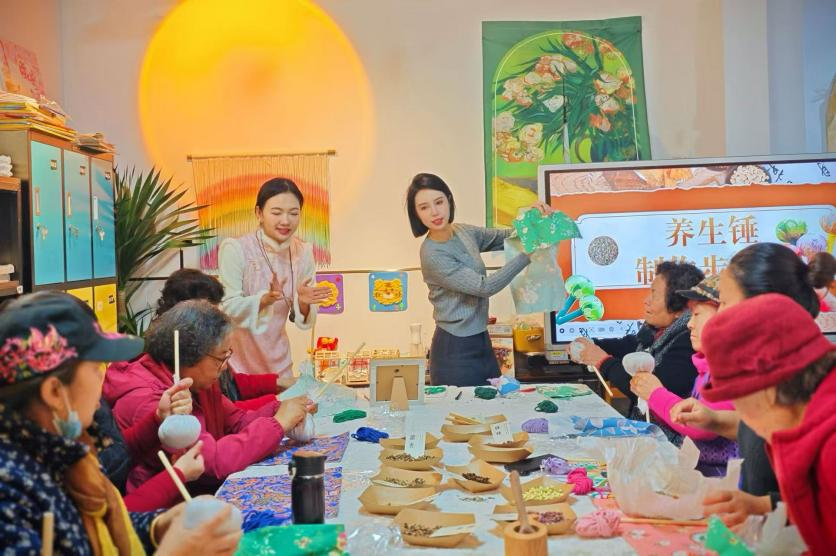 活动现场,居民们学习制作简易养生锤。大家先将艾草、生姜碎等中药原料按比例混合,填入锤体,再用麻绳固定锤头。短短十几分钟,一个个散发着草药清香的养生锤就在居民手中成型。随后,老师现场示范养生锤使用方法,讲解常用穴位的定位与敲打手法。居民们手持自制养生锤,轻敲肩颈舒缓僵硬,叩击腰背释放疲劳。