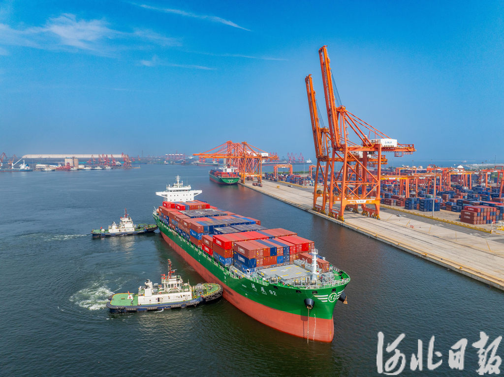 7月8日,一艘货轮在靠泊唐山港京唐港区集装箱码头。河北日报记者赵杰摄