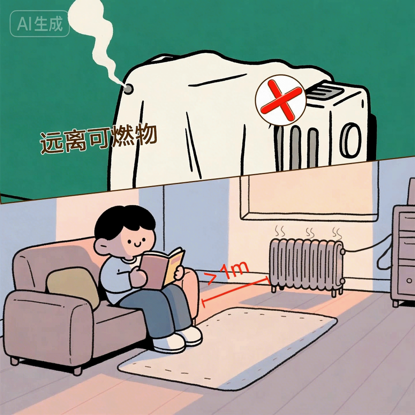 取暖电器温度高,安全距离要留好。切勿在电暖器上覆盖、烘烤衣物,使用时应与窗帘、家具等可燃物保持安全距离,出门时务必断电。