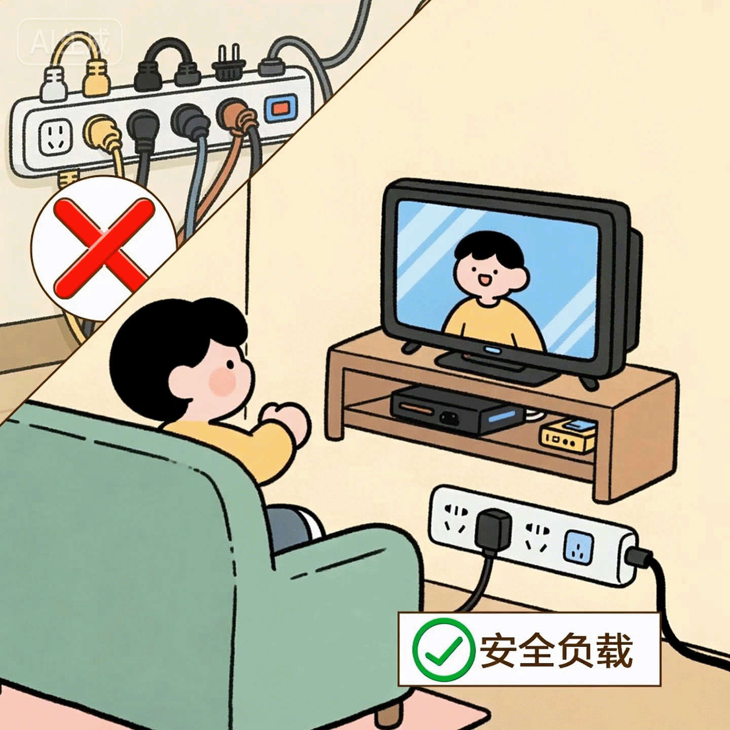 插座不是万能孔,拒绝过载防短路。不私拉乱接电线,不同时在一个插线板上使用多个大功率电器。使用合格电器产品,老旧线路及时换。