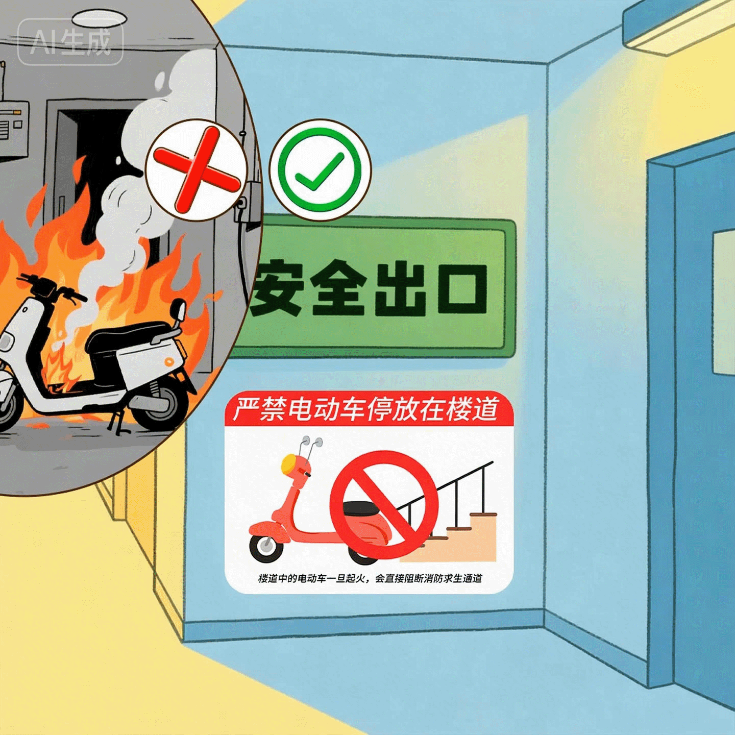 楼道不停车,充电不入户,生命通道请留出!电动车严禁在建筑内楼道、楼梯间、安全出口等公共区域停放或充电。请使用室外集中充电设施。
