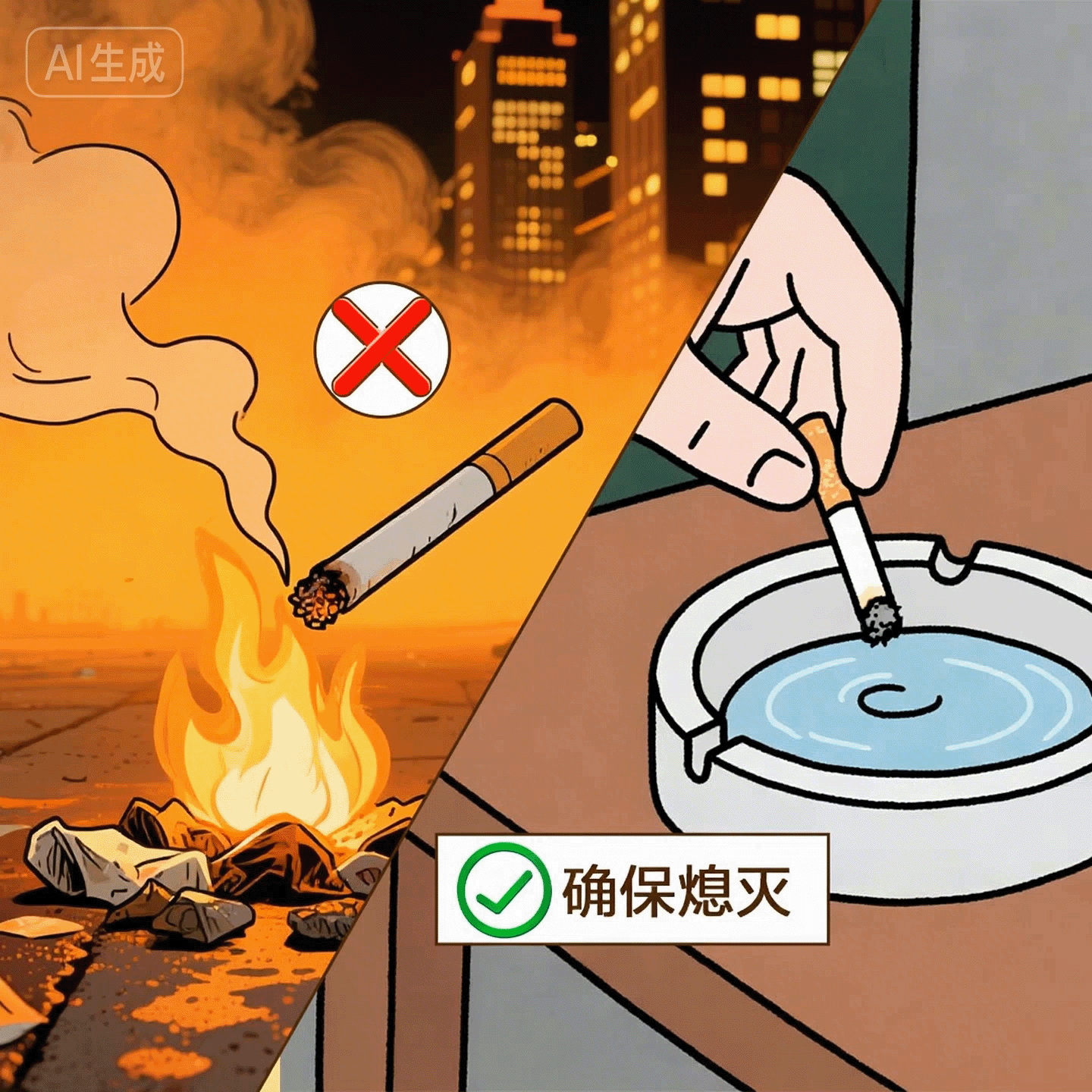 乱扔烟头如弃火,彻底熄灭再处理。切勿卧床吸烟,不要将未熄灭的烟头随意扔进垃圾桶。确保烟头完全熄灭后再丢弃,防止阴燃。