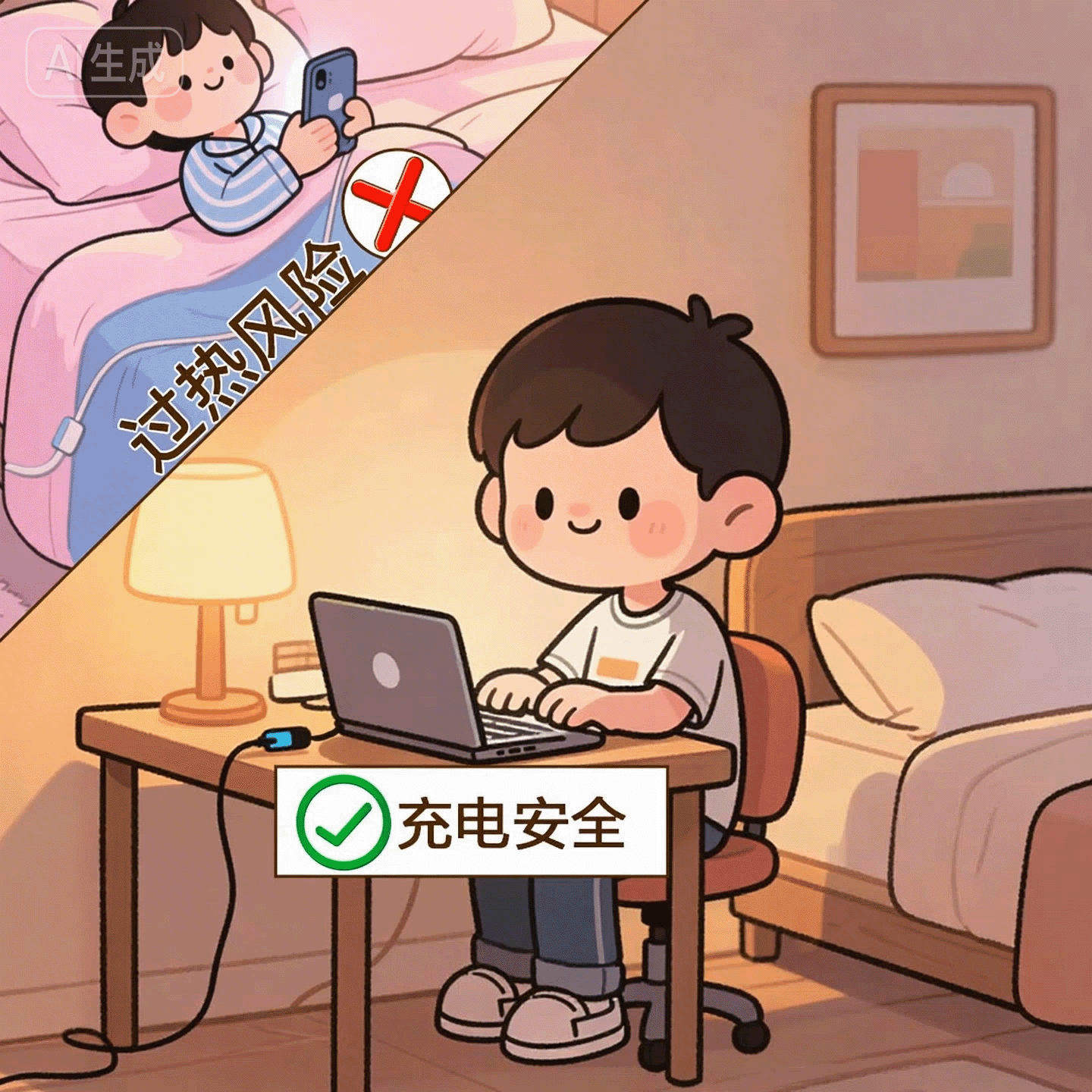 整夜充电隐患大,切勿放置床头边。手机、充电宝等电子设备避免整夜充电,充电时请远离易燃物品,如床单、枕头、沙发。