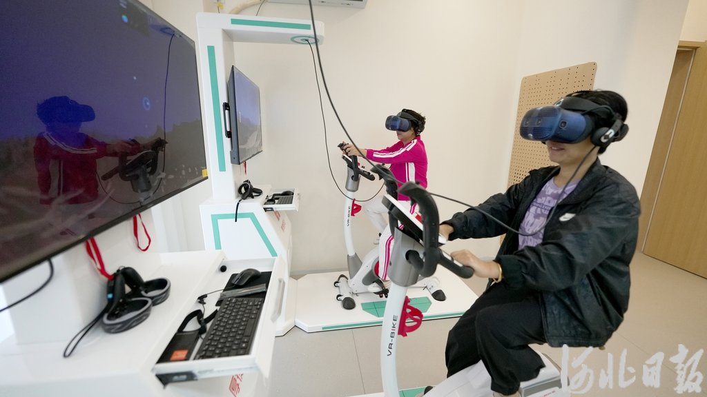 VR运动积极心理空间充满科技感与活力。袁金花戴好VR眼镜,骑上动感单车,车上的心率监测器实时显示数据,眼前则是“黄山之巅”的虚拟美景。“现在每周都来骑两次,既能锻炼身体,还能‘云旅游’,心情都变好了!”她笑着说。