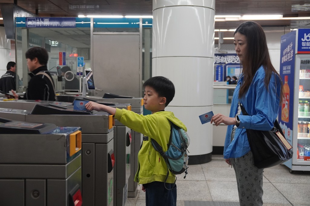5月1日,在北京地铁7号线进站口,保定市民范芮洁(右)和儿子掏出各自的社保卡,将其贴在闸机感应区,顺利乘坐北京的地铁。保定市人社局 供图