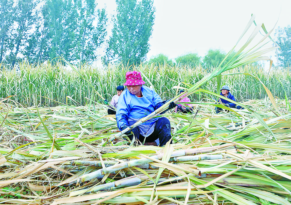 在固安县彭村乡小辛庄村的甘蔗种植地里,农户采收甘蔗。通讯员 陈放 摄