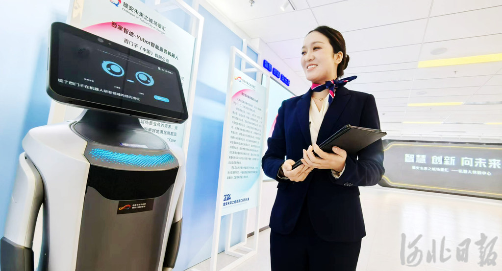 近日,雄安机器人大厦内,工作人员向参观者展示机器人产品。河北日报记者 刘光昱摄
