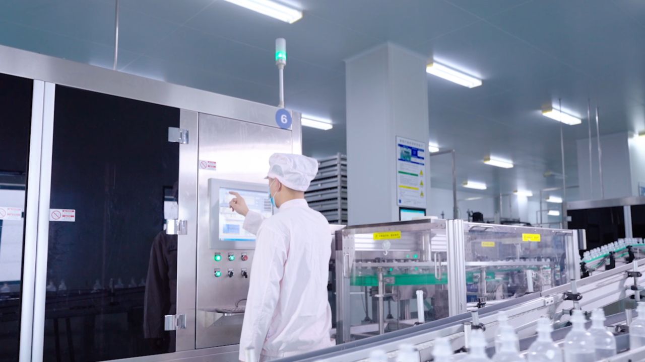 11月14日,记者在石家庄四药集团312车间看到,机械臂在生产线间自如翻转,精准高效完成每一个动作,这样的自动化、智能化贯穿配液、制瓶、灌装、灭菌、灯检、装箱等所有环节,工作人员只需在触摸屏上进行参数设置和操作。