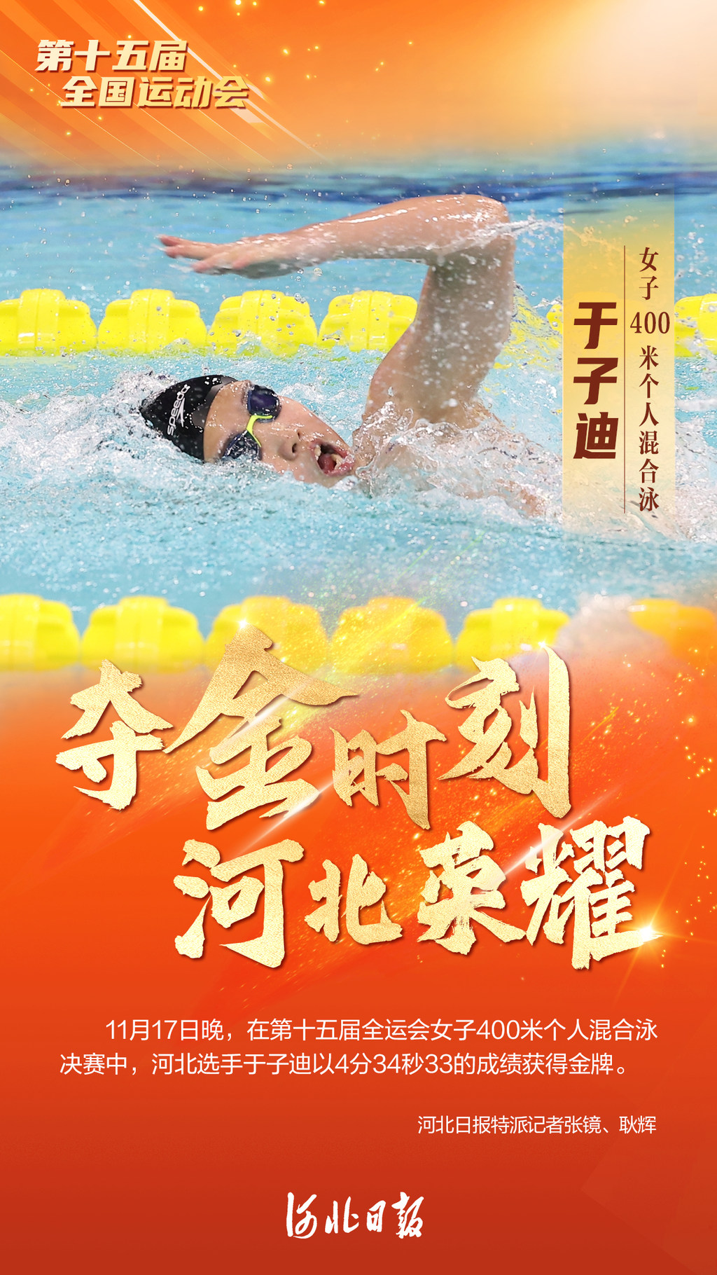 11月17日,第十五届全运会游泳比赛全部完赛。最后一个比赛日中,我省13岁小将于子迪在女子400米个人混合泳决赛中获得金牌,何宇博获得我省男子400米个人混合泳项目首枚全运会奖牌,为河北游泳队本届全运会比赛画上了圆满的句号。