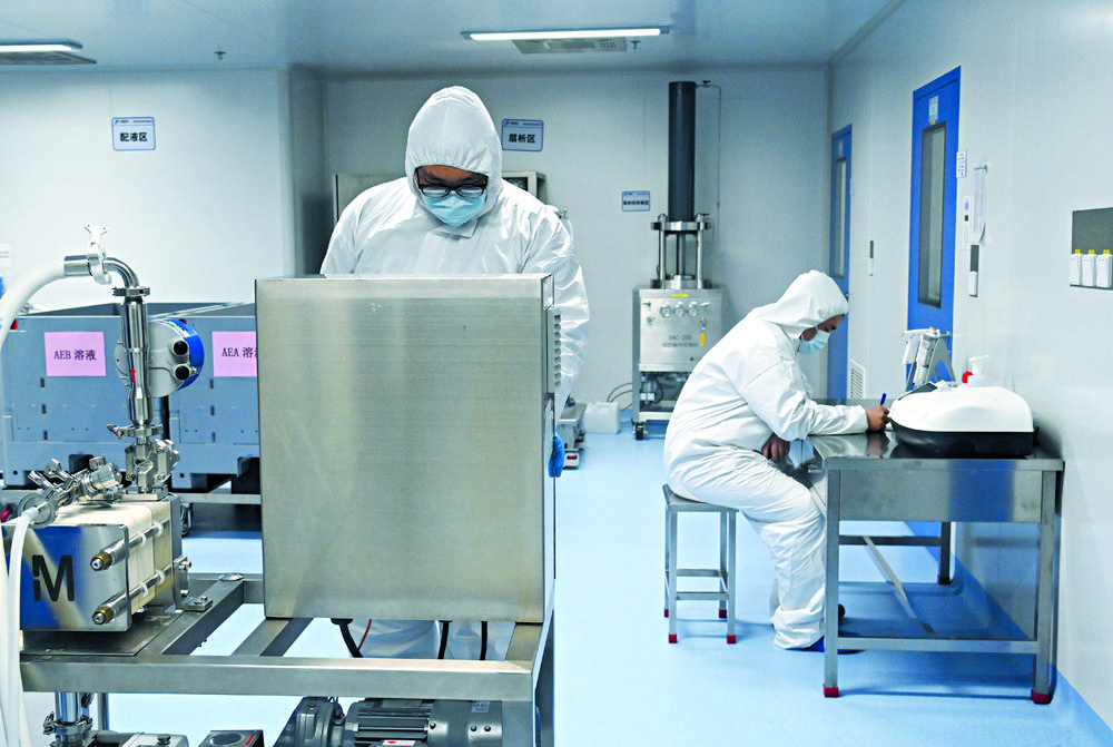 位于石家庄高新区的华普石家庄医药有限公司工作人员正在进行疫苗CpG佐剂研发实验。