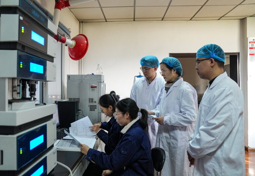 11月3日,在河北智同生物制药股份有限公司,科技特派团团长、中国药科大学教授梁艳(右二)在指导企业制定产品新的质量标准。河北日报记者许佳奇摄