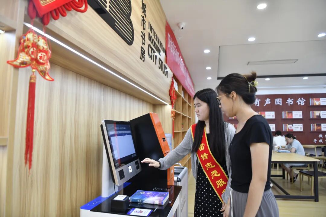 城市书房的志愿者正在帮助读者操作自助借还系统。通讯员殷盼摄