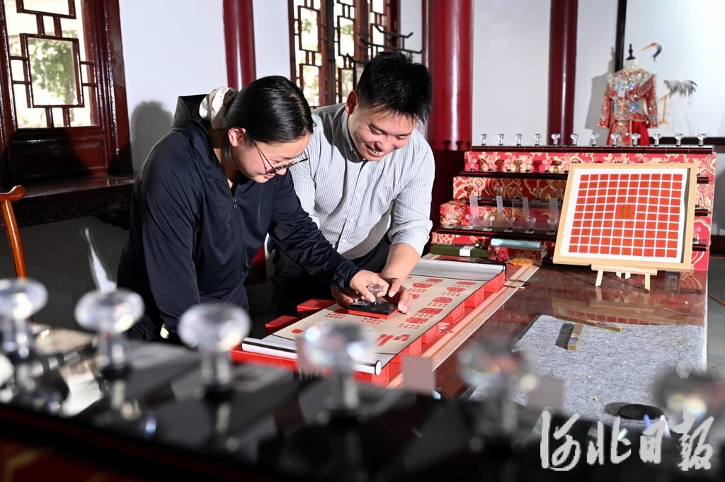 6月21日,冀州区婚姻登记服务中心内,一对情侣一起制作“百喜图”。河北日报记者 焦磊摄