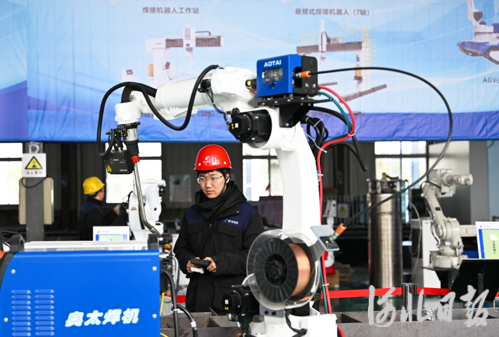 3月4日,位于邢台经济开发区的国家级专精特新“小巨人”企业河北创力机电科技有限公司,工人在调试免试教焊接机器人。河北日报记者赵永辉摄