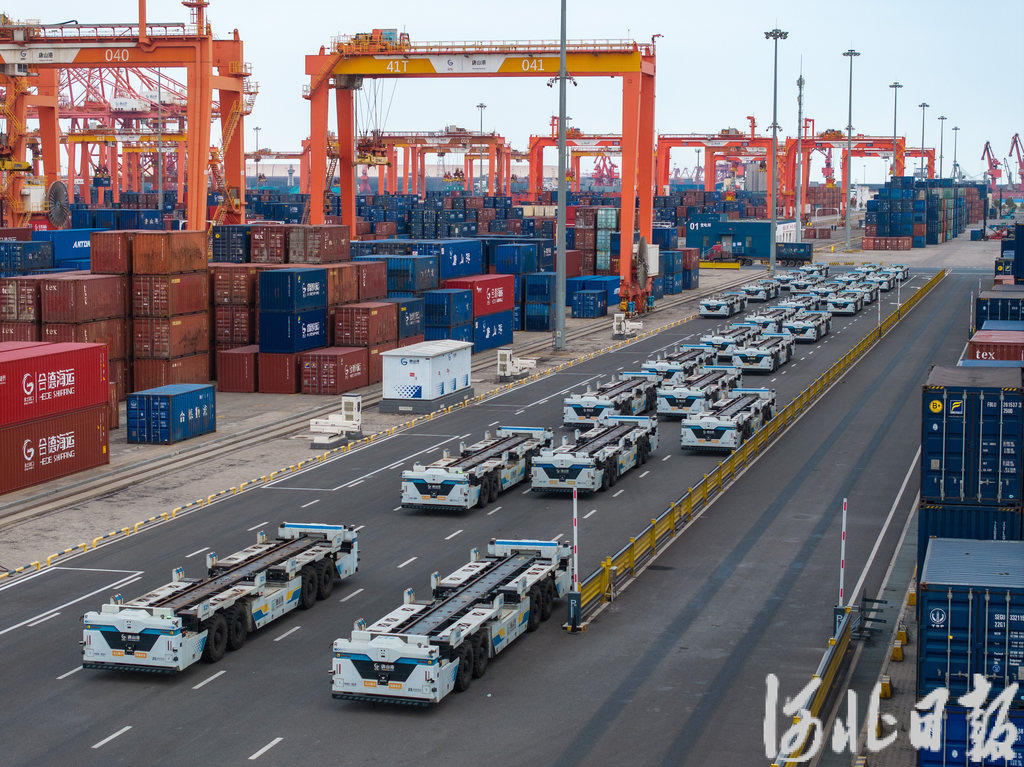 近日,唐山港京唐港区,集装箱码头堆场上智能平板运输车整装待发。河北日报记者赵杰摄