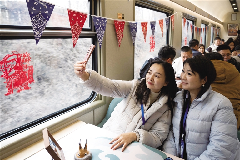 11月26日,游客在Y783次“悠享龙江·银旅号”旅游列车上拍照。