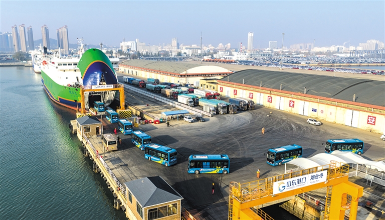 11月30日,一批全新的纯电动公交车在山东港口烟台港登上新能源汽车运输船“绿安达”轮,跨越渤海海峡前往辽宁大连,交付大连交运集团(无人机照片)。 新华社发(张超 摄)