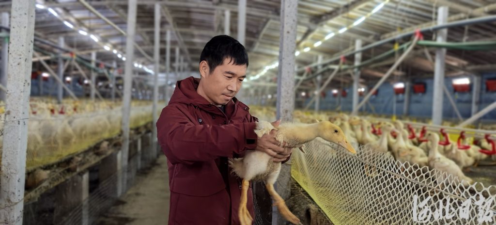 11月18日,在献县河城街镇小屯村东北一处肉鸭养殖场,养殖户李龙旭正在查看鸭子生长情况。 河北日报记者 戴绍志摄