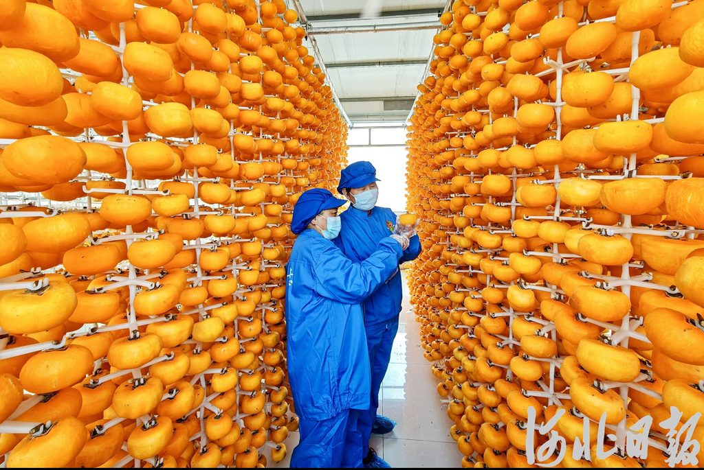 在加工车间里,工人们正在对收购来的柿子进行精细化处理。后续经过清洗、去皮、低温糖化等工序,普通的磨盘柿就会变成甜而不腻的“保定冰柿”,并通过电商平台和线下渠道,销往北京、天津等大城市,成为供不应求的休闲食品。