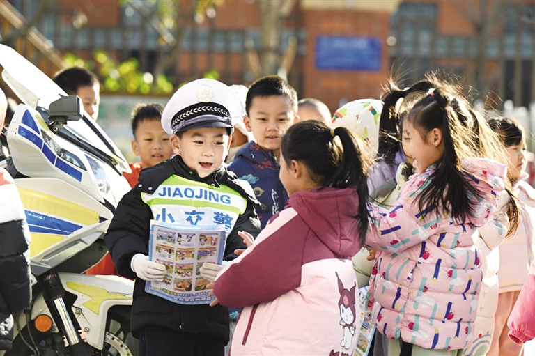 12月2日,在河北省石家庄市新华区柏林幼儿园,一名“小交警”给小朋友发放交通安全宣传页。
