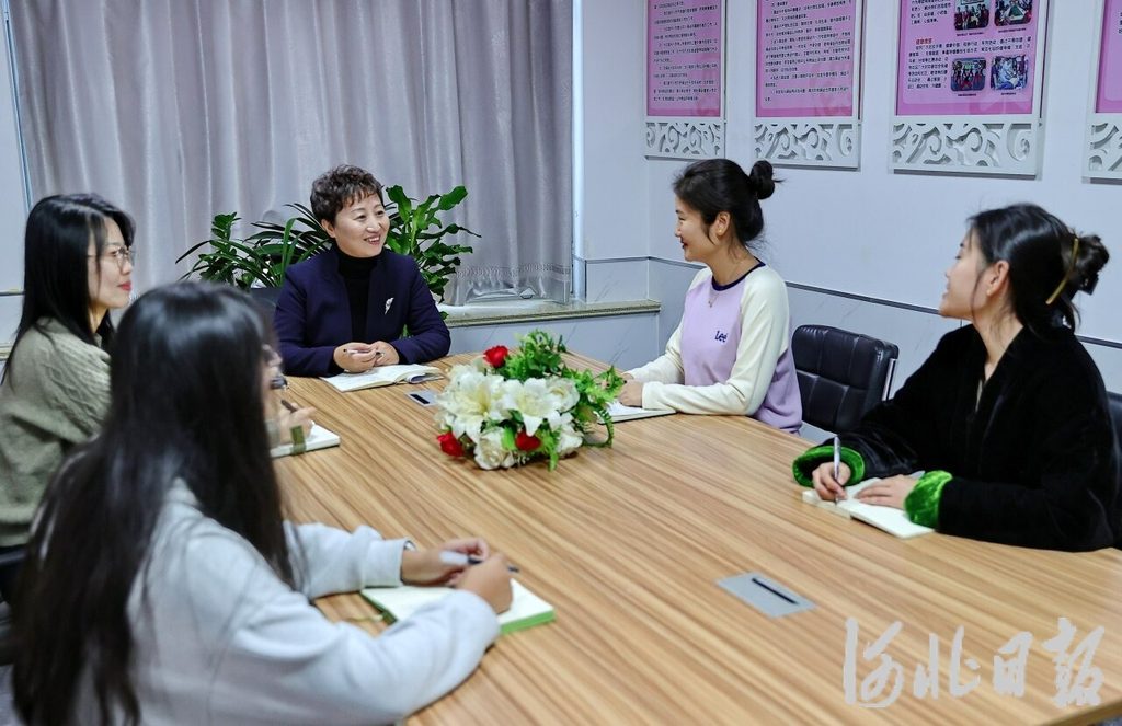 11月26日,秦皇岛市海港区天洋新城社区党委第一书记周慧霞(左三)在和社区工作人员交流。 河北日报记者 赵杰摄