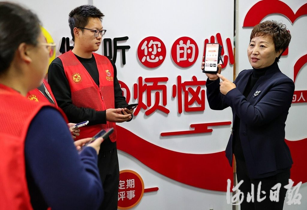 11月26日,秦皇岛市海港区天洋新城社区党委第一书记周慧霞(右一)为社区“爱心代理儿女”介绍“小润社区”小程序。河北日报记者 赵杰摄